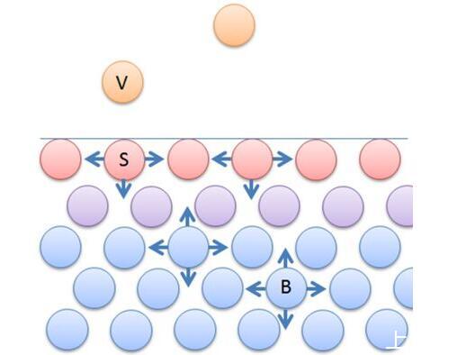 在水中,如B所示,内部水分子所受邻近相同分子的作用力是对称的,各方向的力相互抵消。但物质表面层分子与内部分子周围的状况不同,水最外层分子会受到整个水滴内部分子的斥力,而抵消这个斥力的便是水的表面张力。