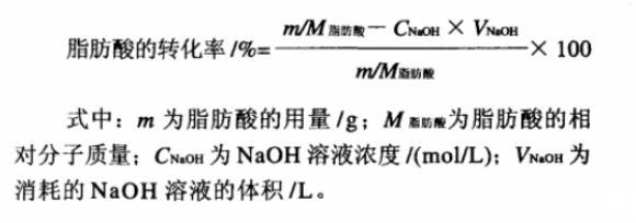 脂肪酸转化率的测定:以酚酞为指示剂,用0.05mol/L NaOH溶液滴定反应液中未反应完的脂肪酸量。计算脂肪酸的反应转化率。