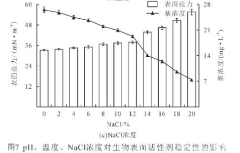 研究了石油降解菌BD-2产生的生物表面活性剂在不同pH、温度和NaCl浓度下的稳定性。如图7(a)所示,在pH小于4时,萘浓度显著下降(P<0.05),发酵液的表面张力显著上升(P<0.05)。当pH为4~10时,表面张力和萘浓度没有显著变化(P>0.05),当pH为10~12时,随着pH的增加,发酵液中萘浓度下降,而表面张力此时上升,并且差异都显著(P<0.05)。结果表明该菌产生的生物表面活性剂具有较好的耐酸碱能力。