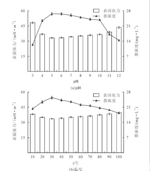 由图6(b)可得,在10~30℃表面活性剂量明显增加,在30℃时表面活性剂量达到最大,为2.18 g/L,表面张力明显降低,从38.2 mN/m降低到23.2 mN/m;而温度超过30℃后表面活性剂量显著下降(P<0.05),表面活性剂量由2.18 g/L降低到0.85 g/L。表面张力显著增加(P<0.05),表面张力由23.2 mN/m增加到35.1 mN/m。