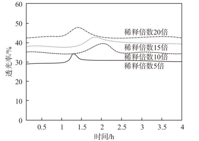 透光率测试结果如图5所示。由图5可知,氨基改性硅油柔软剂稀释倍数与透光率之间呈正比,这是因为水分子的增加使得柔软剂中氨基硅油分子之间的缝隙越大,增加透光率;随着时间的延长,透光率前期存在小幅度的提高和下降过程,但最终也基本维持在一定水平上,证明透光率的稳定性。