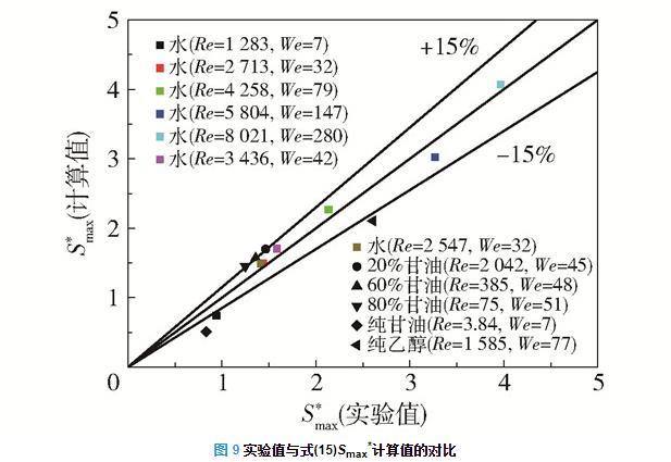 图9为Smax*实验值与式(15)的Smax*计算值的对比,式(15)的Smax*计算值与实验值误差在大部分情况下都小于15%,因此在75 < Re < 9000,7 < We < 300时,可使用式(15)预测液滴撞击不锈钢固体表面的最大铺展面积。