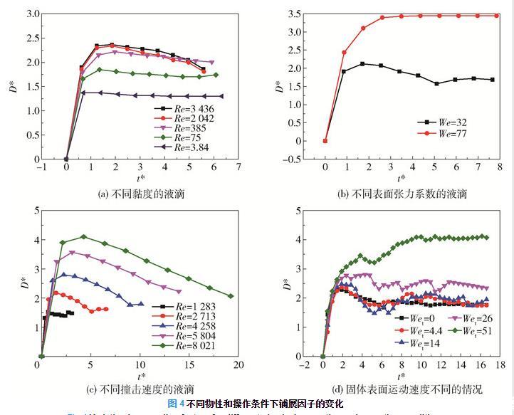 具有一定初始动能的液滴在撞击表面后向外铺展,与此同时液滴的黏性力和表面张力阻碍铺展。液滴到达最大铺展之后开始回缩,此时表面张力则是回缩的驱动力,而黏性力是回缩的阻力。