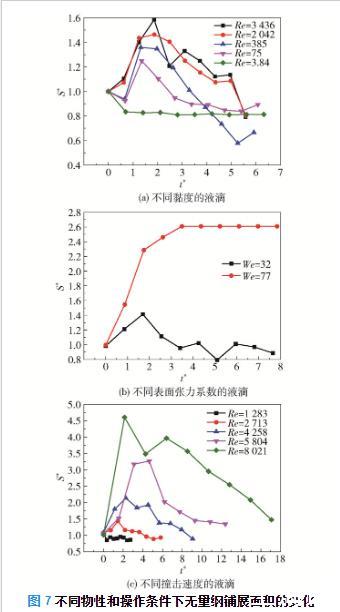 图7不同物性和操作条件下无量纲铺展面积的变化