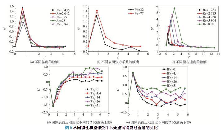 在固体表面水平运动时,定义液滴上游方向为液滴铺展与固体表面运动相同的方向,反之为液滴下游方向。如图5(d)所示,液滴上游铺展线速度(绝对值)在撞击后的短时间内增加到最大值,但由于其方向与固体表面运动方向相反,随着固体表面运动速度的增大,液滴受到的黏性力增大,且上游铺展线速度降低。液滴上游铺展线速度降至0之后,黏性力与上游铺展线速度的方向开始相同,此时黏性力作正功,因此固体表面运动速度的增大会使得上游铺展线速度增大,直至上游铺展线速度与表面运动速度相等。如图5(e)所示,在撞击的瞬间,液滴下游铺展线速度大于表面的运动速度,此时黏性力做负功,且下游铺展线速度会逐渐减小至固体表面运动速度。