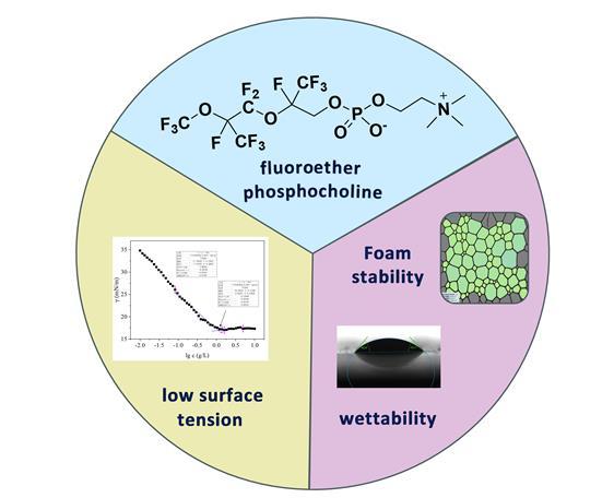 将氧原子引入到氟磷酸胆碱表面活性剂中,会对磷酸胆碱性能产生怎样的影响呢?蜜桃性爱视频网站设计合成了一种新型氟醚磷酸胆碱表面活性剂(图1b),考虑到长氟碳链和长氟醚链段具有生物累积性,蜜桃性爱视频网站选用了氟碳链为6的短链结构,并向其中插入两个氧原子,将新化合物与一个链长相近的氟磷酸胆碱表面活性剂进行对比,结果表明新型氟醚磷酸胆碱表面活性更佳。蜜桃性爱视频网站进一步探索了新氟醚磷酸胆碱的泡沫性能与润湿性能,结果表明氟醚磷酸胆碱的稳泡性好、可在聚四氟乙烯(PTFE)上润湿,是一类具有良好应用前景的表面活性剂。
