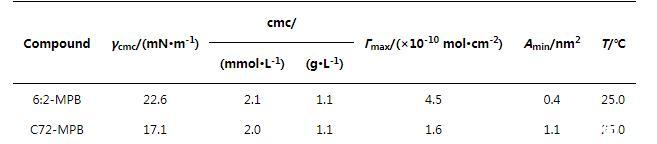 分别配制C72-MPB和6:2-MPB水溶液,测试不同浓度下的表面张力,如图3和表3所示,C72-MPB和6:2-MPB的临界胶束浓度均为1.1 g/L。然而,两种表面活性剂在临界胶束下的表面张力(γcmc)有明显差距,C72-MPB和6:2-MPB的γcmc分别为17.1 mN/m和22.6 mN/m(图3)。