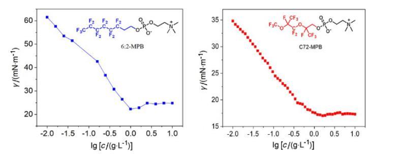 氟磷酸胆碱为两性表面活性剂,其n值为1,R为气体常数(8.314 J•mol-1•K-1),T为绝对温度,γ和c分别为表面活性剂的表面张力和水溶液浓度。NA是阿伏加德罗常数(6.022×1023 mol-1)。