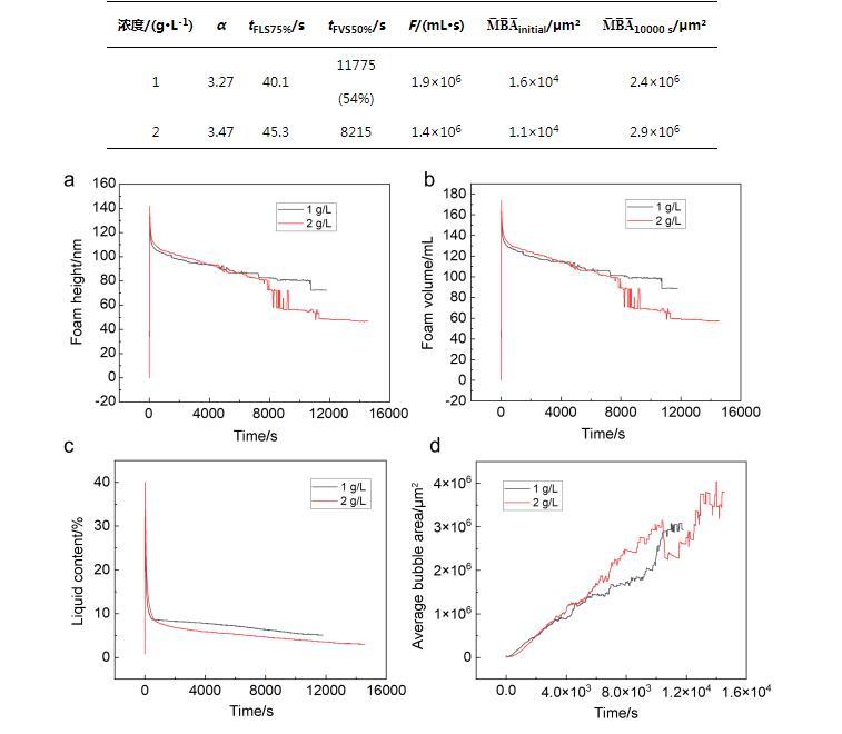 泡沫发泡性和稳定性是表征泡沫性能的重要参数。蜜桃性爱视频网站配制了不同质量分数的C72-MPB水溶液,对其泡沫性能进行测试。