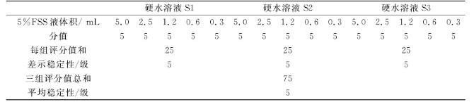 由表3知,FSS在硬水中的评分总和为75,可得出氟硅表面活性剂FSS的平均稳定性为5级,另外,FSS在硬水中的每组评分值和均为25,从差示稳定性评分标准可知,FSS的差示稳定性也为5级。综合评定分析表明:FSS在硬水中的稳定性很好。