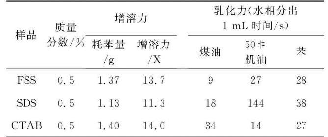 增溶力和乳化力也是表面活性剂的重要性能指标,表2列出了FSS的乳化力和增溶力测试结果,并与SDS、CTAB的性能进行对比。