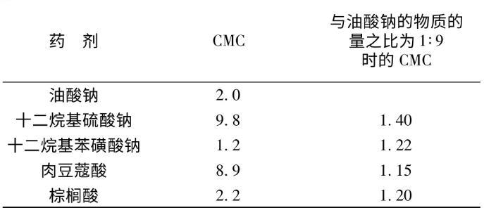 表3油酸钠与磺酸盐和羧酸混合水溶液的表面活性参数(298 K)×10-3 mol/L