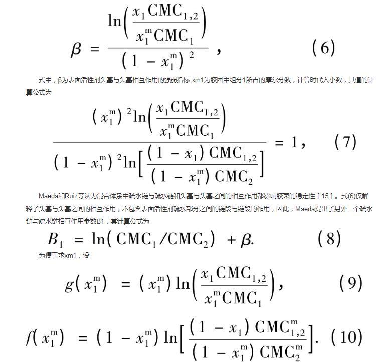 式中,β为表面活性剂头基与头基相互作用的强弱指标;xm1为胶团中组分1所占的摩尔分数,计算时代入小数,其值的计算公式为