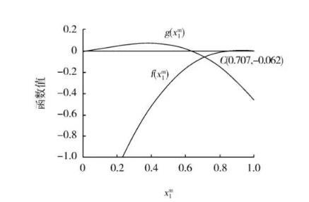 图2 g(x m1)和f(x m1)关于x m 1的曲线