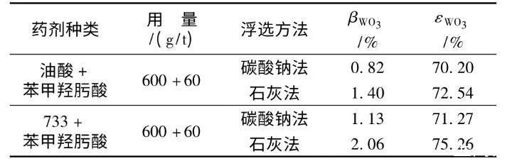 羧酸类捕收剂与苯甲羟肟酸是两类典型的氧化矿浮选组合药剂,两者都可用于白钨矿浮选,两类药剂的浮选试验结果如表4所示。