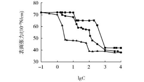 对于在水中溶解度较低的捕收剂,如油酸或低温下的油酸钠,加入表面活性剂后,油-水界面张力降低,有助于油酸药效的发挥。油-水界面张力难以测定,但可用溶液的表面张力来衡量,油酸钠溶液及加入表面活性剂后的油酸钠溶液的表面张力与油酸钠浓度C的关系见图1。