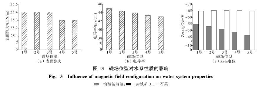 由图3可知,1号磁场位型条件下,油酸钠的表面张力、电导率和赤铁矿的Zeta电位绝对值均最大。