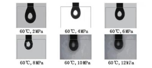 表面活性剂水溶液液滴在CO2中的形状随温度变化较小,随压力变化关系见图4。