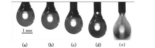 由于液滴形态是影响表面张力测量准确度的重要因素,液滴的控制与选择是提高测量准确度的关键步骤。图3为采用10μL微量进样器缓慢增加液体量时的液滴形态照片,样品为黏度系数50 mm2/s的硅油,其中图3(a)为液滴刚形成时的形态图像,图3(d)为液滴下落前平衡时的形态图像,图3(e)为液滴下落时的形态图像。根据照片得到悬停液滴的形状因子S=ds/de分别为:(a)0.746;(b)0.744;(c)0.744;(d)0.739,因此,随着液滴中液体量的增加,悬滴从近球形变化为椭球形,形状因子稍稍减小。根据式(3)计算得到不同液滴形态下的硅油表面张力系数,分别为:(a)0.019 1 N/m、(b)0.019 2 N/m、(c)0.019 5 N/m、(d)0.019 7 N/m。由此可见,对于同一种液体,当液滴处于不同形态时,计算得到的表面张力系数存在差别。根据文献[14],黏度系数50 mm2/s的线性结构甲基硅油的表面张力系数为0.020 5 N/m,因此,对于不同形态的液滴,测量的相对误差分别为:(a)6.8%;(b)6.3%;(c)4.9%;(d)3.9%。结果表明,当液滴达到下落前的临界状态时,测量的相对误差最小。实验还采用了25、50μL的微量进样器来产生液滴,发现由于每次液体量的增加较多,表面张力和重力相平衡的临界状态较难控制,难于形成较好的悬滴。因此,采用悬滴法测量液体表面张力系数时,通过小容量(例如10μL)的微量进样器控制液滴形态,选择液滴下落前平衡时的形态图像,可以减小测量的相对误差,获得接近真实值的表面张力系数。