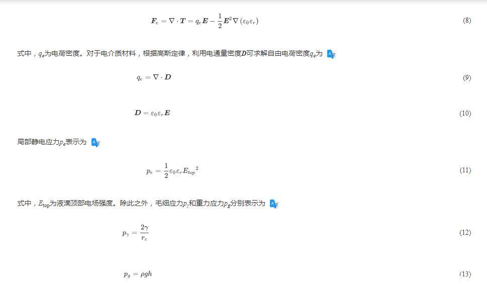 式中,ε0为真空介电常数,εr为液体相对介电常数,ke为液滴导电率。本实验全程在空气常温环境下进行,此环境下去离子水(ke=5×10-6 S/m)的介电弛豫时间τe大约为在1.77μs,而液滴撞击过程维持了几十毫秒,远远大于介电弛豫时间,因此印证液滴在撞击过程中实现了充分的电荷积累,其撞击行为深受电流体力学影响。
