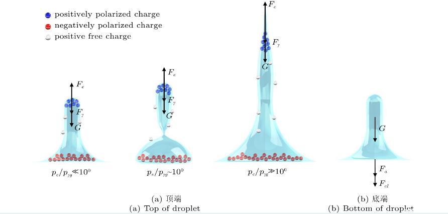 图4(a)为液滴顶端所受力的方向和液滴整体电荷分布。液滴接触下极板后,由于离子迁移和极化电荷的产生,中性液滴立即极化,其顶部带正电荷,底部带负电荷。根据库伦定律,电场方向垂直向上,作用在液滴顶部的静电力Fe是向上的,与电场方向相同,使液滴不断向上拉伸,液滴拉伸高度增加,而表面张力Fγ和重力G使液滴向下收缩。基于上述的分析,各个模态的产生机理均可通过静电力、表面张力和重力三者间的博弈关系来分析。三种作用力对液滴的影响大小可用局部静电应力pe、毛细应力pγ和重力应力pg来表示。静电力的大小由麦克斯韦应力张量T的散度给出,可表示为