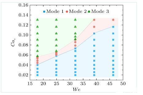 液滴撞击韦伯数可以显著影响液滴的动力学行为,尤其是铺展与拉伸过程,且在外加电场力的作用下必会进一步加深对液滴撞击行为的影响。本文研究对象为低韦伯数,在此范围内,液滴的动态行为涵盖铺展、回缩、拉伸及振荡。通过对不同韦伯数下液滴撞击行为的实验数据分析表明:在相同的电场强度下,随着液滴韦伯数的增大,液滴产生的模态呈现出显著差异,如图5所示。具体而言,当电场强度维持在较高状况且保持一致时,撞击We的增加导致液滴的拉伸高度明显减小,同时液滴模态从第三种模态逐步过渡到第二种模态,并最终转变为第一种模态。