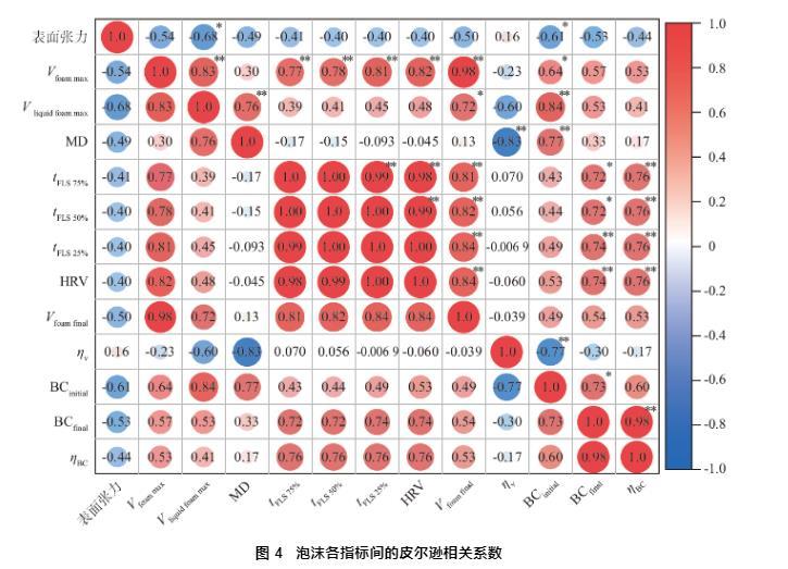 使用皮尔逊相关系数来阐明10种表面活性剂泡沫各指标间的相互关系,如图4所示。