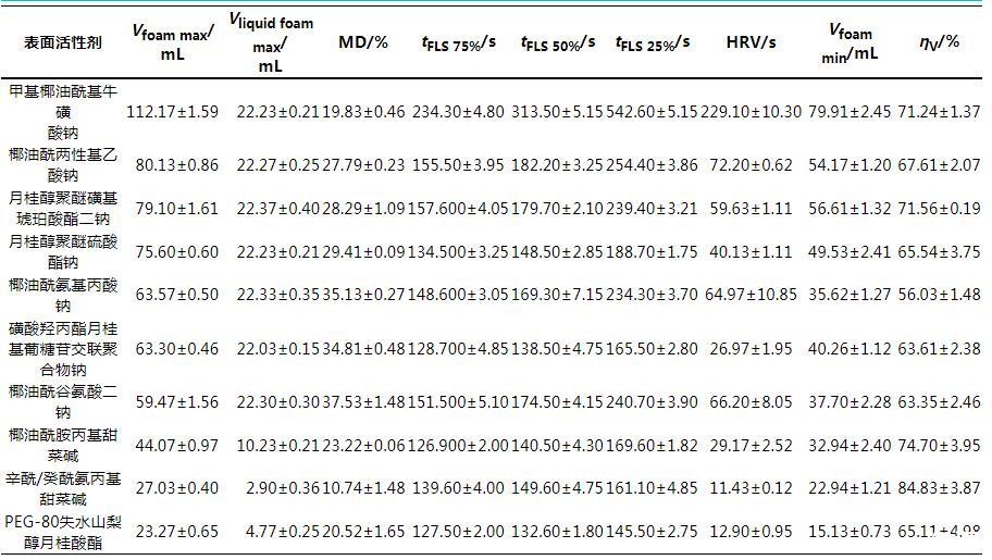 表4不同表面活性剂的泡沫体积、体积保留率、含液量等指标结果