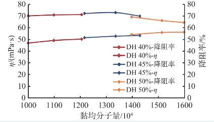 室内通过控制水解度(40%~50%)制备了一系列的SRY-1样品,配制成浓度为0.5%的溶液,测试聚合物不同分子量下的表观黏度(30 min)和降阻率(Q=45 L/min)。如图2所示,在优化的水解度范围内,SRY-1分子量均在1000万以上,水解度越高,分子量越高;溶液表观黏度随分子量的增大而增大,但降阻率随分子量的增大呈现先缓慢升高后较快降低的趋势。主要是因为分子量越高,重复单元数愈多,分子间越易形成链缠结,分子链具有更大的流体力学体积,溶液黏度增大,当增大到一定范围,溶液黏弹性受到影响,降阻率就随之下降。由数据对比,SRY-1分子量控制在1200~1300万为宜。