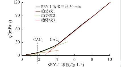 据研究表明,缔合聚合物溶胀经历3个阶段,分别对应了两个黏度突变的点,即临界缔合浓度CAC;通过绘制聚合物溶液黏度-浓度曲线,拟合分析得到3个阶段的趋势线及公式,两两相交的点取绝对值即为临界缔合浓度值,计算得CAC1,CAC2,如图3所示。根据曲线可以看出,在CAC1之前,溶液黏度增长趋势较缓慢,当达到CAC1并向CAC2过渡时,溶液黏度增长相对加快,超过CAC2后,溶液黏度迅速增加,1.0%用量下终黏可达110 mPa·s以上。