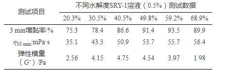 采用提纯的聚合物,参照GB 12005.6—89《部分水解聚丙烯酰胺水解度测定方法》进行水解度的测定。室内进行了水解度控制单体比例为20%、30%、40%、50%、60%、70%的一系列聚合实验,制得不同水解度的SRY-1样品,参照GB 12005.6—89《部分水解聚丙烯酰胺水解度测定方法》测试水解度分别为20.3%、30.5%、40.5%、49.8%、59.2%、68.9%。分别配制0.5%SRY-1溶液,测试3 min、30 min表观黏度,并进一步进行了定频率定应力黏弹性扫描实验(测试条件f=1 Hz、τ=0.5 Pa、t=5 min)和降阻性能测试实验(Q=45 L/min),测试结果见表2。