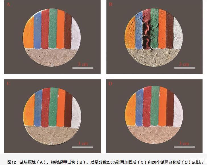 图12可以看出,硅丙乳液加固前后与加固老化20个循环后颜料层无明显差异,这一结果说明硅丙具有较好的兼容性、透气性和耐老化性,因而可以作为一种性能优异的胶凝材料用于修复起甲的壁画中。