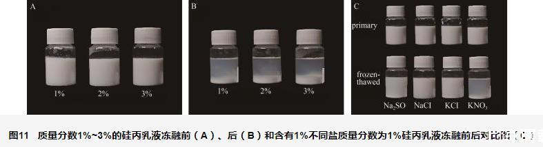 图11质量分数1%~3%的硅丙乳液冻融前(A)、后(B)和含有1%不同盐质量分数为1%硅丙乳液冻融前后对比图(C)