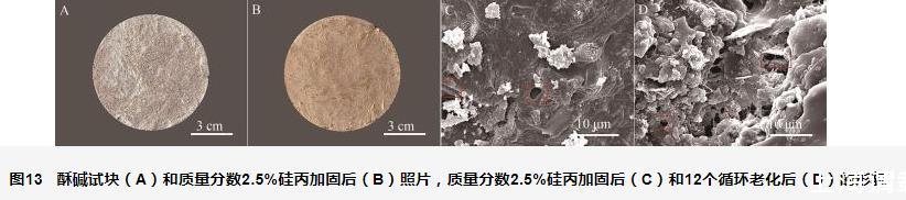 酥碱试块(图13A)经硅丙乳液修复后再进行湿热老化12个循环,肉眼观察发现加固后的试块(图13B)表面无酥碱等病害。此外,对加固后以及12次循环老化后的试块进行SEM分析。从图13C可以看出,修复加固后试块内部能看到明显的成膜现象,说明硅丙乳液渗透加固性较好;而老化12个循环后(图13D),成膜现象仍然存在,进一步证明硅丙乳液具有较强的收缩性和耐老化性。因而可以将其作为性能优异的胶结材料用于酥碱壁画的修复中。