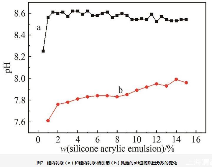 测定20℃下不同质量分数(1%~15%)的硅丙乳液和硅丙乳液-硫酸钠的pH值变化,结果见图7。可以看出,随乳液质量分数从0.5%到2%的增大,pH值逐渐由8.25上升到8.63,这是因为稀释碱性乳液可以降低溶液的pH值;之后在2%~15%范围内,pH值基本保持在8.63,说明乳液在溶液中含量过饱和,达到电离平衡,呈现弱碱性(图7曲线a)。当硅丙乳液中加入质量分数1%的硫酸钠时,Na+会对聚合物链形成“电荷屏蔽效应”和“离子交联”效应使乳液体积收缩,导致乳液中的—COO-被部分质子化转变为—COOH,导致—COO-的电离能力下降,故和硅丙乳液相比,硅丙乳液-硫酸钠的pH值下降(图7曲线b)。