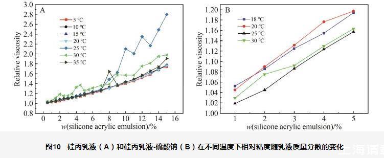 图10硅丙乳液(A)和硅丙乳液-硫酸钠(B)在不同温度下相对粘度随乳液质量分数的变化