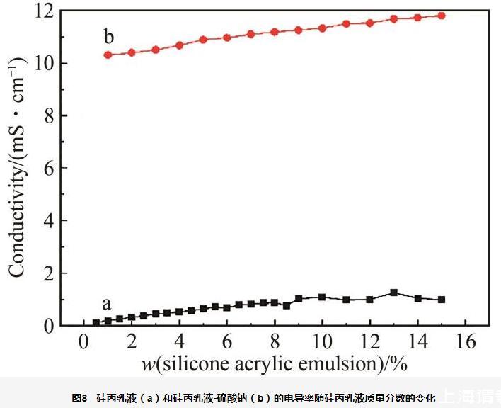 图8硅丙乳液(a)和硅丙乳液-硫酸钠(b)的电导率随硅丙乳液质量分数的变化