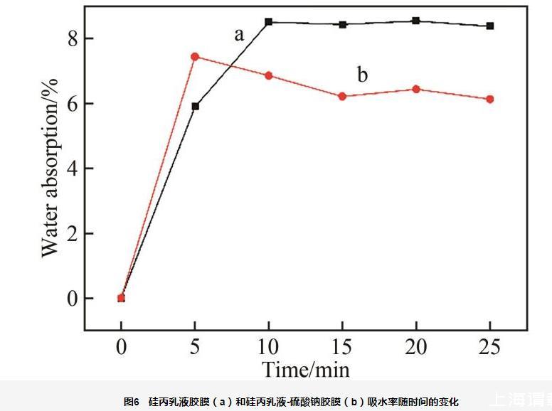 图6研究了硅丙乳液胶膜和硅丙乳液-硫酸钠胶膜的吸水率,可以看出,随时间增加,硅丙乳液的吸水率也逐渐增大,造成这种现象的原因是硅丙乳液分子结构中的―OH和―COOH遇到水分子时形成氢键,在范德华力和氢键作用下,胶膜表现出一定的吸水性。另外,从图6还可看出,硫酸钠胶膜的吸水率较小,这是因为胶膜网络结构中的硫酸钠在水中完全电离,胶膜三维网络结构中的Na+对胶膜中的―COO-产生电荷屏蔽效应,使胶膜三维网络结构内外溶液的渗透压差降低。同时,外部溶液中的Na+与网络结构中的―COO-发生“离子交联”,导致胶膜网络结构中有效交联密度增大,吸水率下降。