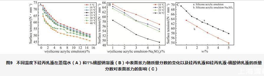 图9不同温度下硅丙乳液在蒸馏水(A)和1%硫酸钠溶液(B)中表面张力随质量分数的变化以及硅丙乳液和硅丙乳液-硫酸钠乳液的质量分数对表面张力的影响(C)