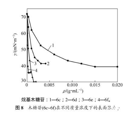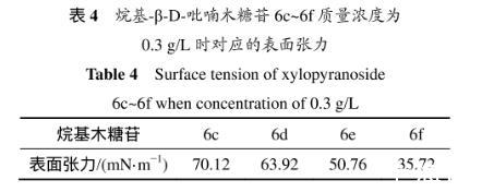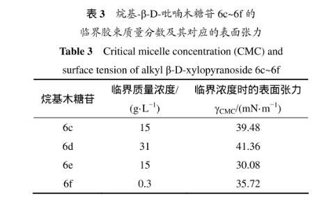 表3所示为烷基-β-D-吡喃木糖苷6c~6f的临界质量分数及所对应的表面张力。溶液表面的吸附量达到饱和时(刚好饱和时的浓度即为临界浓度),表面张力最小。从表3可以看出:辛基-β-D-吡喃木糖苷(6e)达到临界浓度时对应的表面张力是最低的,能力最强。因为烷基木糖苷的表面活性是由其亲水糖基和疏水烷基链共同决定,当烷基链长为=8(糖苷6e)时,亲水性和疏水性达到最佳平衡,表面张力最低。