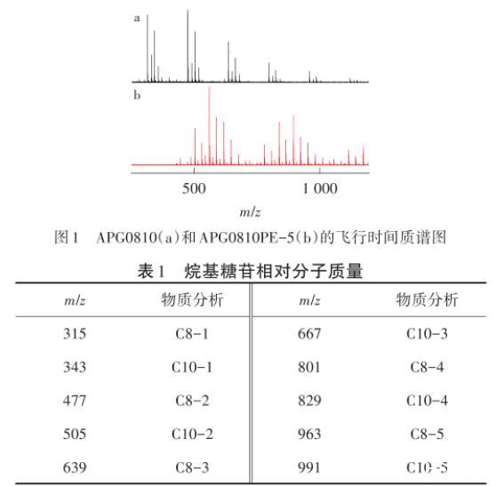 由图1可以看出,m/z315表示单糖苷的C8烷基糖苷,m/z343表示单糖苷的C10烷基糖苷,m/z477与m/z315相差M(162),162表示一个葡萄糖脱掉一个水的相对分子质量,APG0810的分子质量组成分析如表1所示。