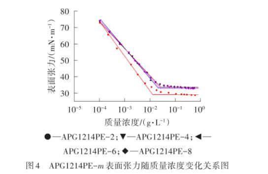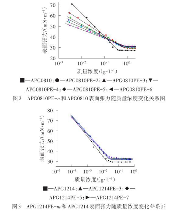 平衡表面张力揭示了表面活性剂降低溶剂(通常是水)表面张力的能力。表面活性剂的许多应用都与平衡表面张力有关,例如起泡作用、润湿作用、铺展作用等。图2为APG0810PE-n和APG0810平衡表面张力随着质量浓度变化的关系图,图3、图4为APG1214PE-m和APG1214平衡表面张力随着质量浓度变化的关系图,相应的物化性能参数列于表3。