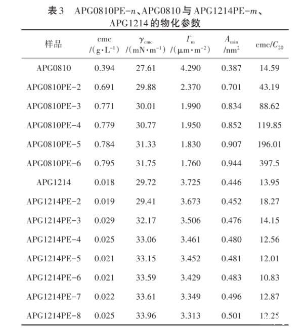 由表3可以看出,APG0810PE-n的cmc、γcmc、Amin均高于APG0810,且随着PO添加量的增加而增大,PO基团的引入增加了分子的空间位阻以及被吸附分子在气/液界面所占的面积。因此,Гm会随之降低,并且随着PO基团的增加降低得更明显。同样,对于APG1214PE-m也有相同的趋势。