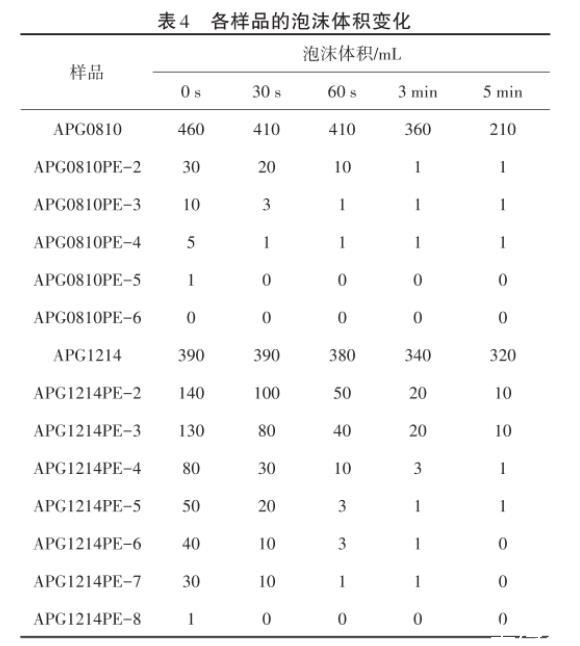 泡沫是气体在液体中的分散体系,气体成为气泡被连续相的液体分隔开,气体是分散相,液体是分散介质。在大规模的洗涤和印染工业中,泡沫给操作带来不便,因此新型的低泡表面活性剂越来越受关注。由表4可以看出,PO基团引入APG中明显地降低了泡沫的形成和稳定性,而且在相同PO加合数下,APG0810变化更明显,因此制备的系列样品属于低泡表面活性剂。