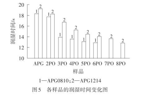 由图5可以看出,APG0810PE-n和APG1214PEm的润湿时间随着PO加合数的增加而减少。这是因为表面活性剂在湿润帆布片时,PO基团的引入为分子提供疏水性,提高了分子与帆布片之间的疏水相互作用,促使分子易于吸附在帆布片表面,有利于润湿。而APG1214和APG1214PE-m的润湿时间比APG0810和APG0810PE-n长,说明随着碳链增长,润湿性能变差,这是因为分子长度增加打破了亲水亲油平衡状态,不利于润湿。