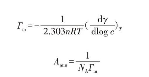 其中:T表示绝对温度,通常取298 K;R表示气体常数,通常取8.314 J/(mol·K);NA表示阿伏加德罗常数,通常取6.022×1023;n也表示常数,对于离子表面活性剂n取2,对于非离子表面活性剂n取1;dγ/dlogc是指在恒温情况下,表面张力γ随表面活性剂浓度对数logc变化的变化率。