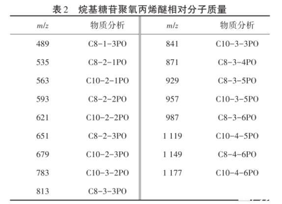 表1中,C8-1为8个碳的醇和1个葡萄糖反应生成的APG,以此类推,C10-5为10个碳的醇和5个葡萄糖反应生成的APG。APG加成PO后相对分子质量会增加58的倍数。例如,在APG0810PE-5样品谱图中,分子质量489为C8-1加成3个PO的产品,535为C8-2加成1个PO的产品,621为C10-2加成2个PO的产品,1 119为C10-4加成5个PO的产品。结果表明PO基团已经成功引入烷基糖苷分子中,具体分析数据如表2所示。