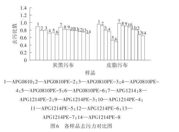 污垢通过不同的相互作用力在物品表面附着,而应用表面活性剂去除的污垢一般是通过物理吸附(范德华力、偶极相互作用)或者静电作用而附着于物品上。去污力是指将固体表面浸泡在一定的液体介质中去除污垢的能力,使用洗涤剂减少污垢在固体表面的附着量,利用机械力使污垢与固体表面分离。由图6可以看出,无论是皮脂污布还是炭黑污布,制备的APG0810PE-n和APG1214PE-m的去污比值都低于对应的原料APG0810和APG1214,而且随着PO加合数的增加而降低,可能是由于PO基团的引入使得分子的疏水性提高。但整体来看,PO改性APG获得的产品去污性能仍处于较好的水平。