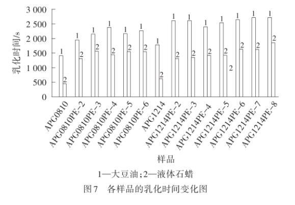 由图7可以看出,采用乳液破乳时间表征表面活性剂的油水界面性质,APG1214和APG1214PE-m乳化大豆油以及液体石蜡的能力胜于APG0810以及APG0810PE-n,而且随着PO加合数的增加而提高。这是由于PO基团和烷基链增长提供了疏水性,增强了乳化剂分子的乳化能力,延长了破乳时间。此外,所有表面活性剂乳化大豆油的能力均明显强于乳化液体石蜡,表明PO基团可能具有类似极性作用,可以增强样品与极性分子之间的协同作用,因此乳化性能更好。