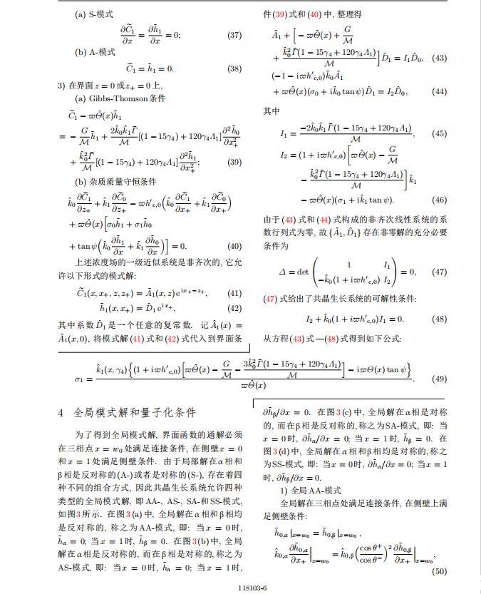 为考察共晶生长形态稳定性,利用共晶生长的定常解作为基态进行稳定性分析.在初始时刻t=0时对基态解做一小扰动,并将在t>0以后形成的非定常解分解成两个部分: